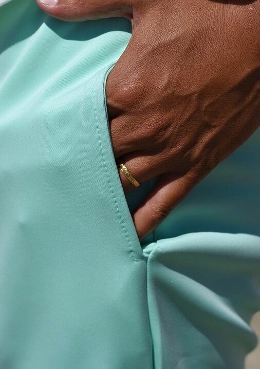 膝上丈ですっきりとしたシルエットに、裾はスリット入りで動きやすさにもこだわりました。