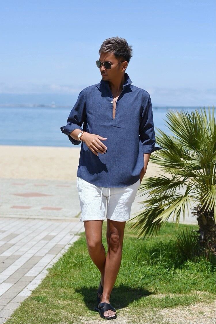リゾート感を演出してくれるプルオーバータイプの日本製カプリシャツ。