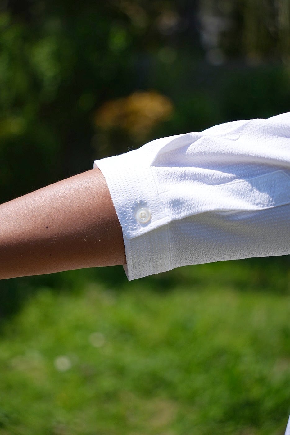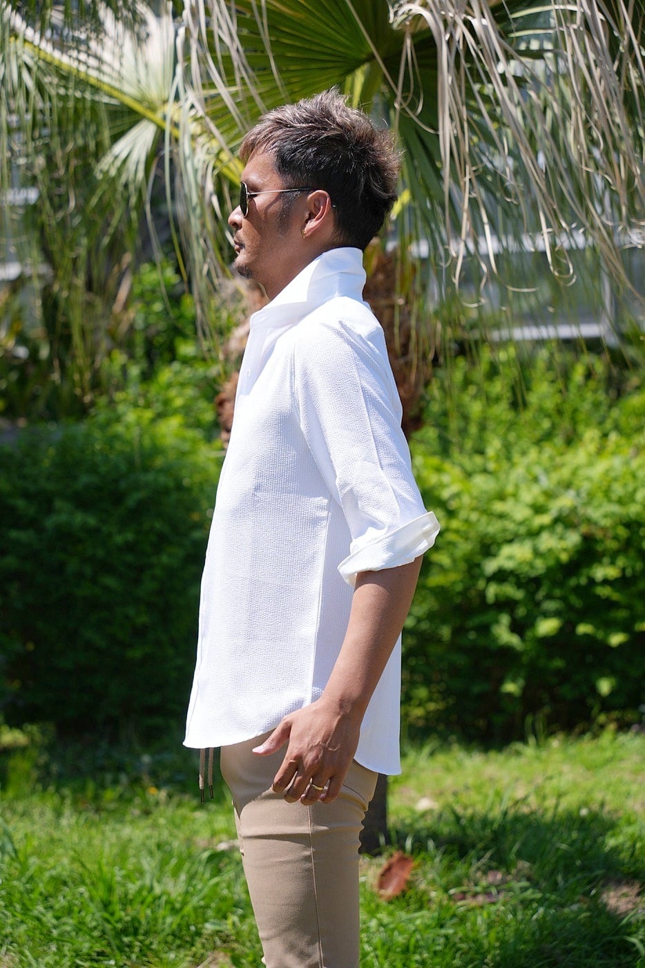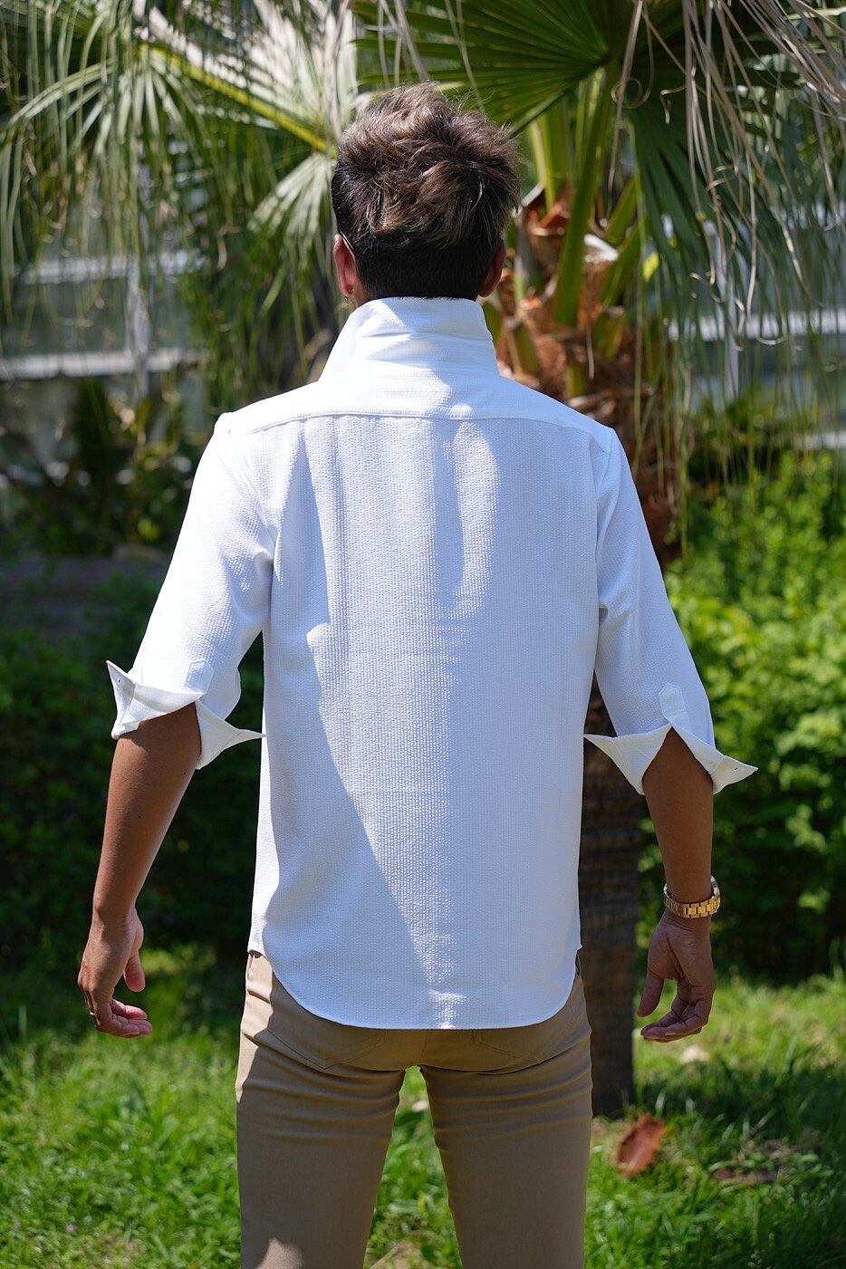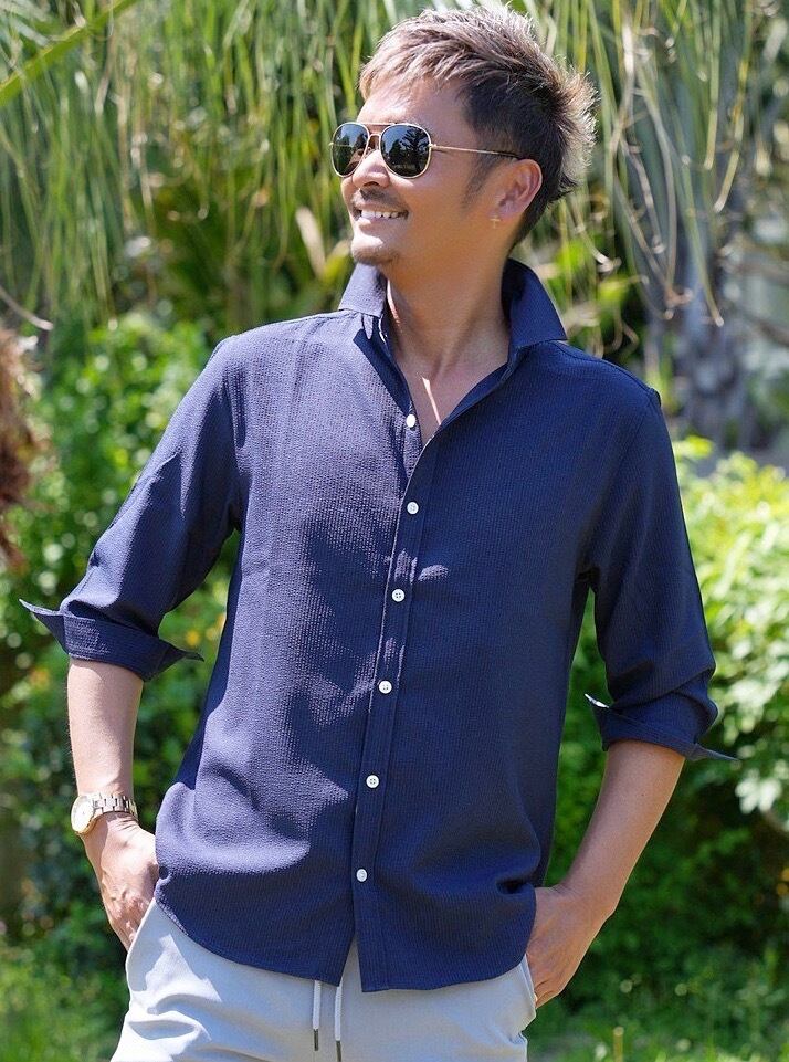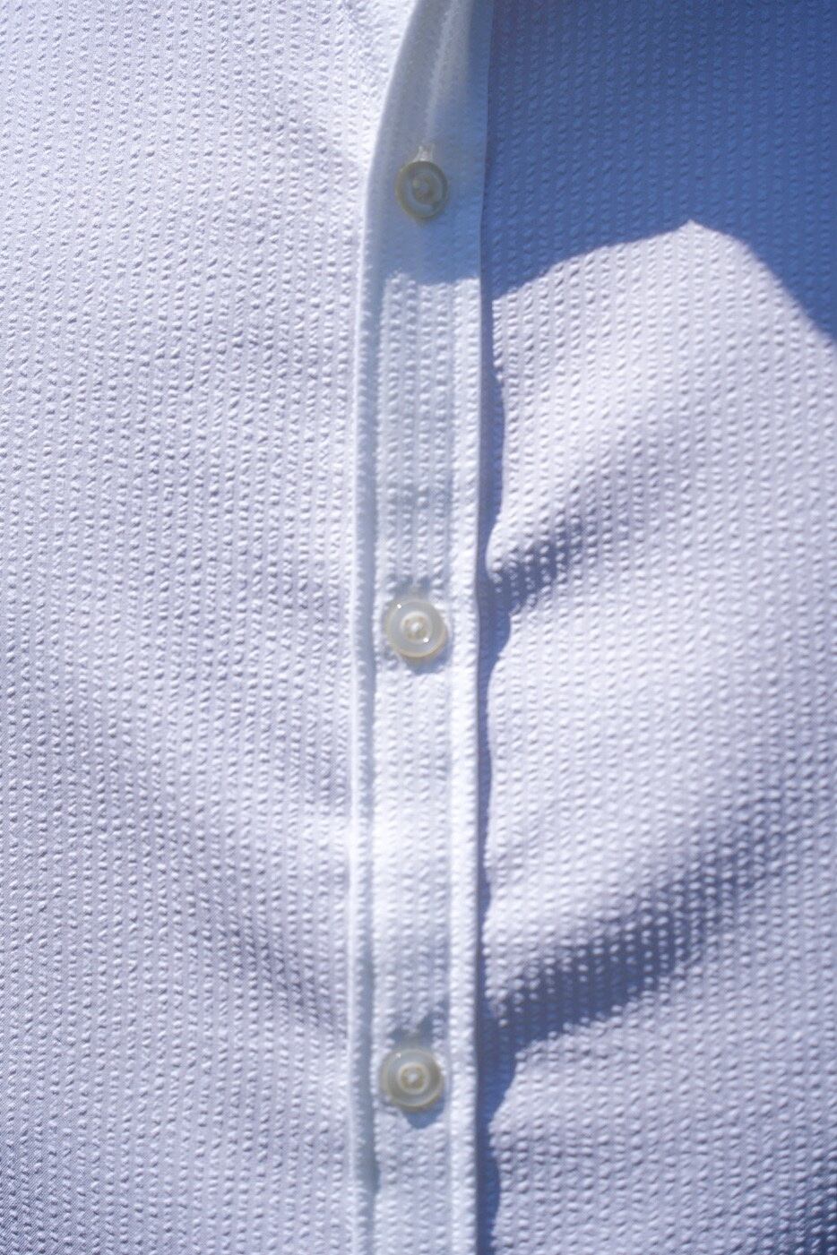 表面の凹凸が特徴的で通気性に優れたシアサッカーの生地は清涼感がありこれからの時期に最適な一枚です。