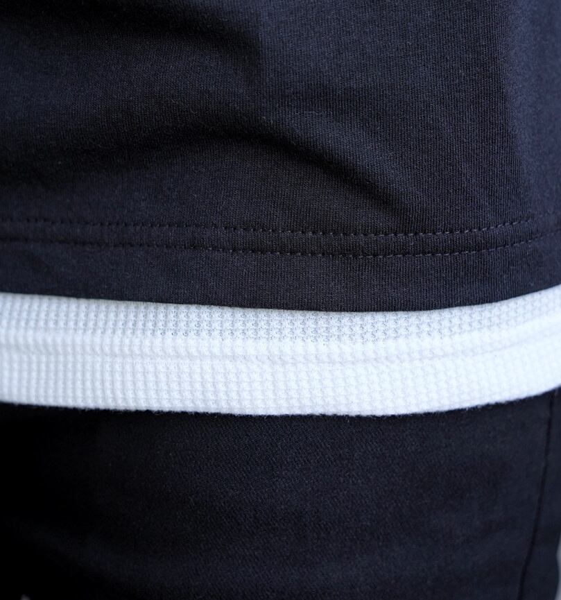 袖部分は、半袖の袖口から長袖のフェイクスリーブがつながった仕様になっており、自然なレイヤード感を演出します。