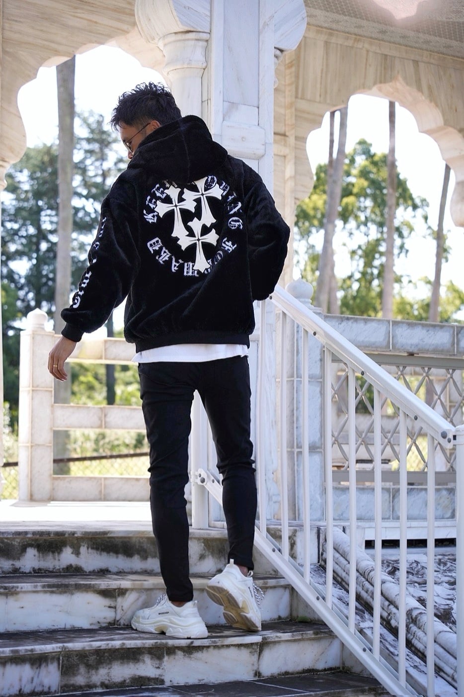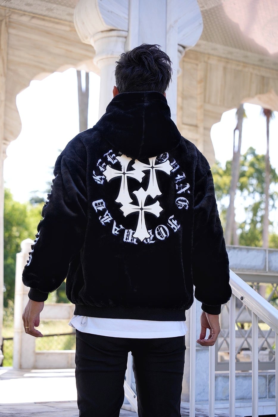 2025 新作 冬 高品質 ☆ オールドイングリッシュ クロス ロゴ ファー ジャケット メンズ レディース パーカー フード ブルゾン 暖かい 上品 もこもこ 海外 ファッション