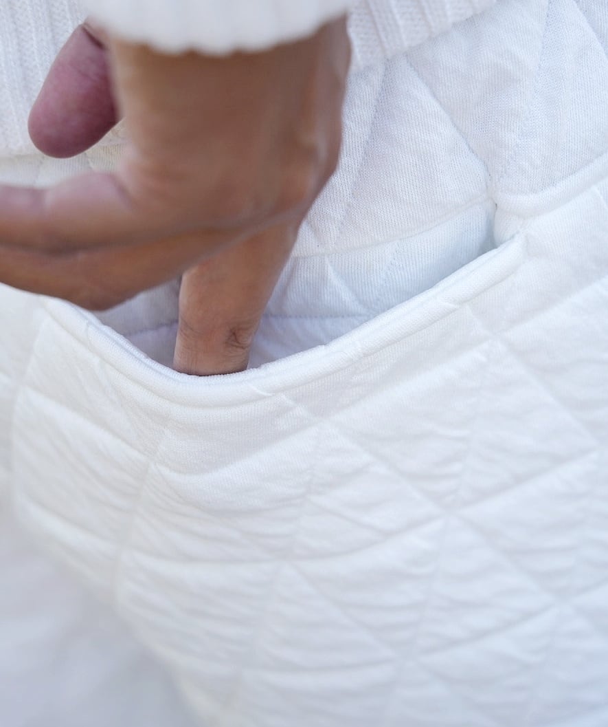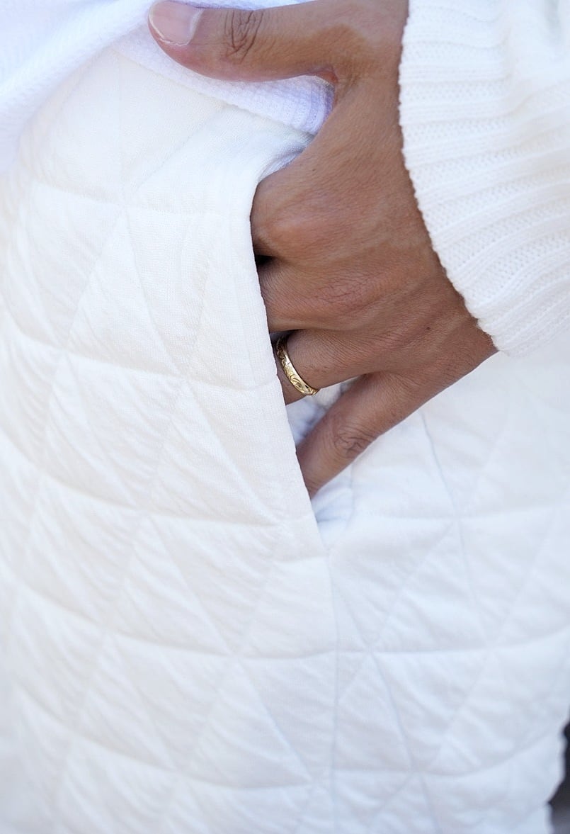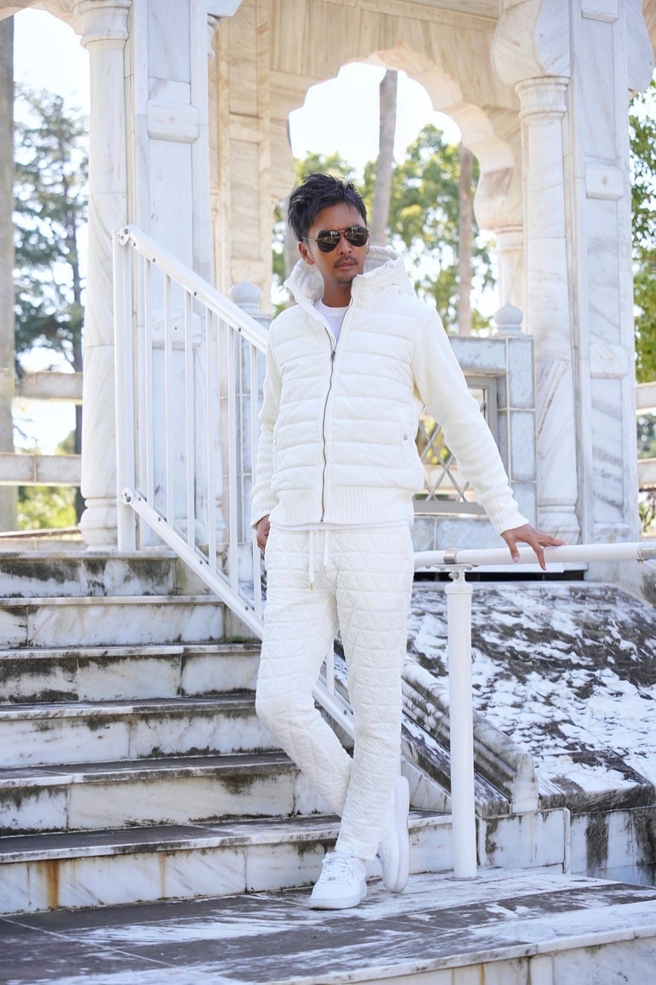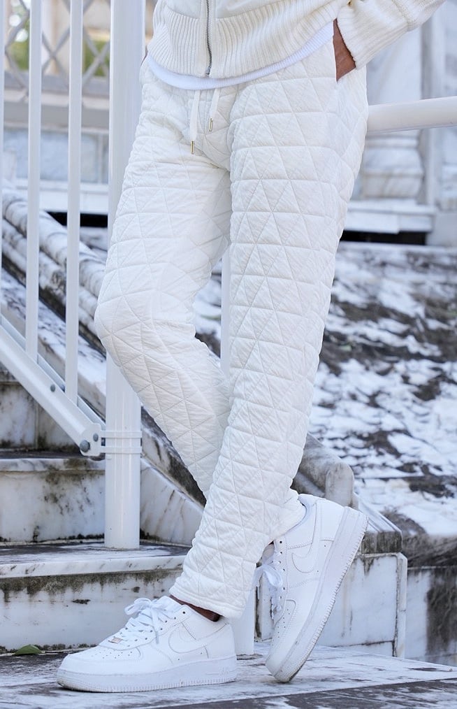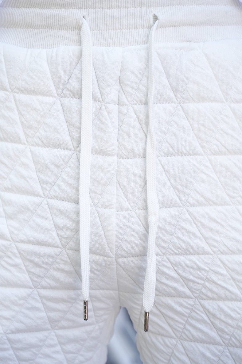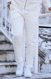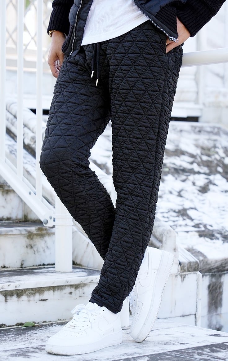 自宅でのリラックスタイムから休日のお出かけまで幅広く活躍する、まさに“大人のための万能キルティングパンツ”です。