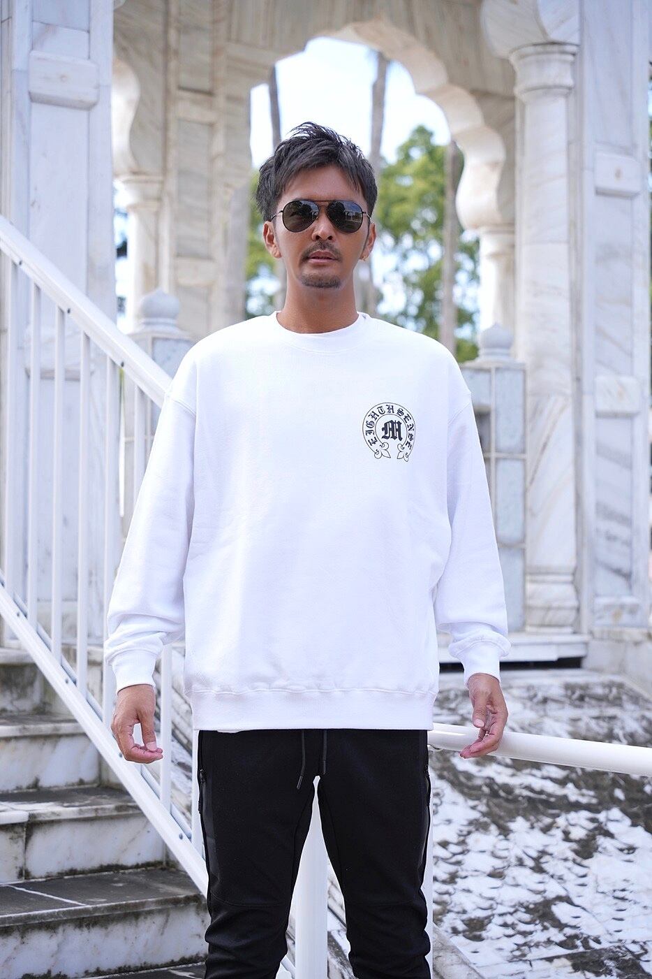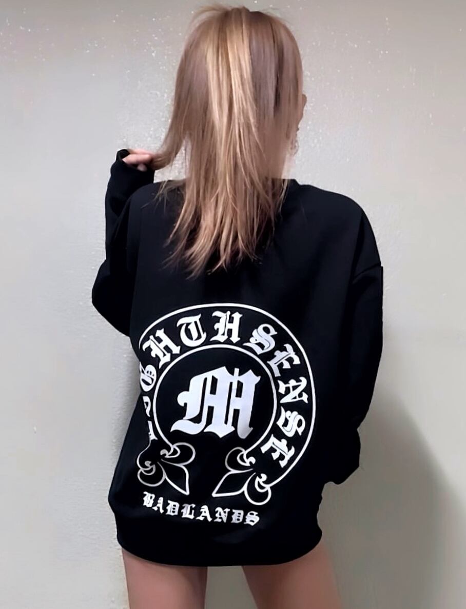●存在感を放つブラックレターフォントのサークルロゴバックプリント
