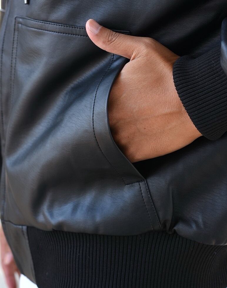 ハードなレザーの質感とカジュアルなパーカースタイルを融合させた、ストリート感溢れるアウター。