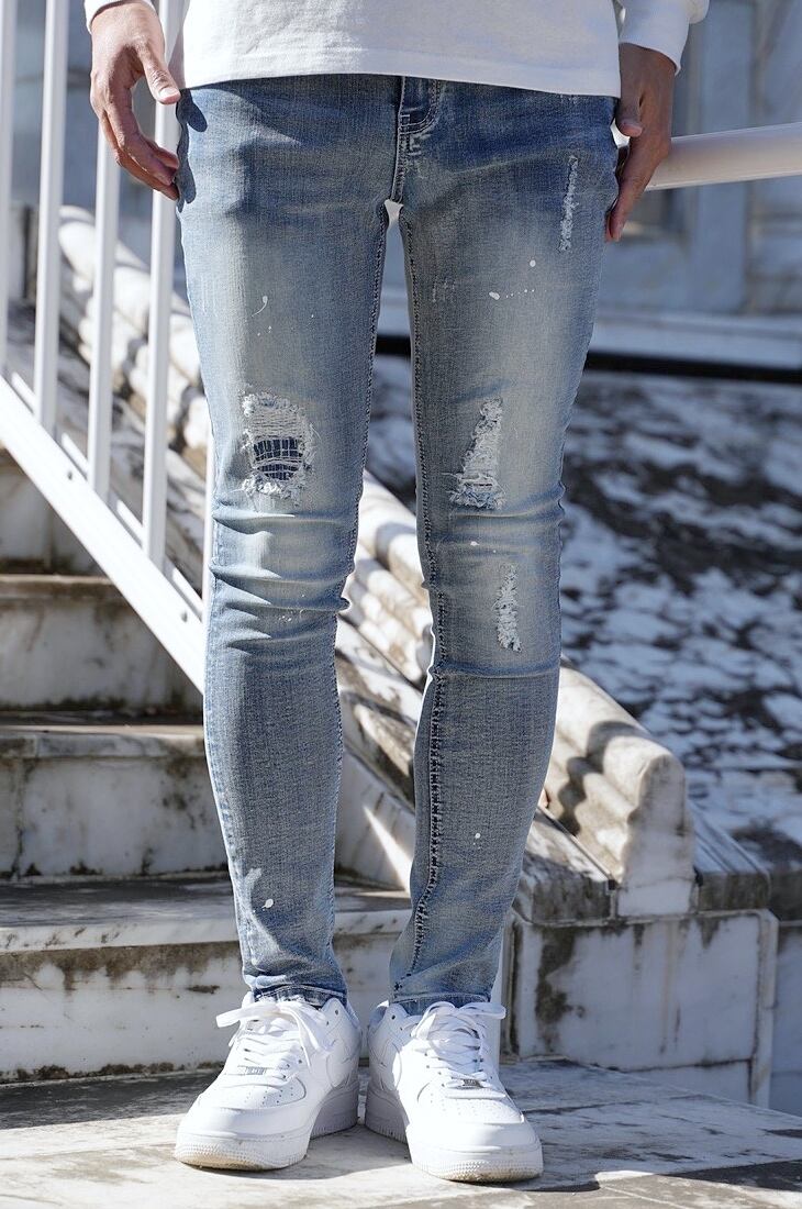 [ ペンキ 加工 ダメージ リペア ストレッチ スキニー デニム パンツ ]