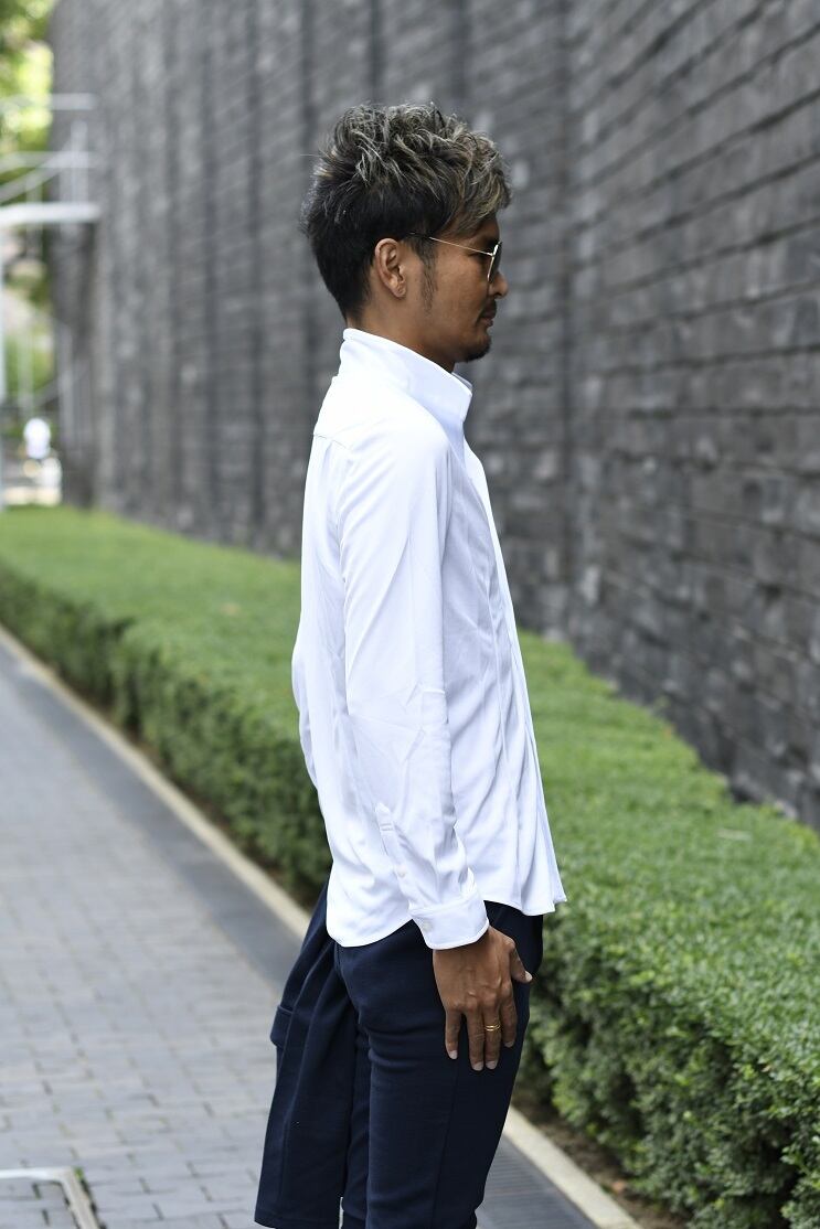 ワイヤー入りでキレイな襟立ちをキープできるイタリアンカラーのカットシャツ。