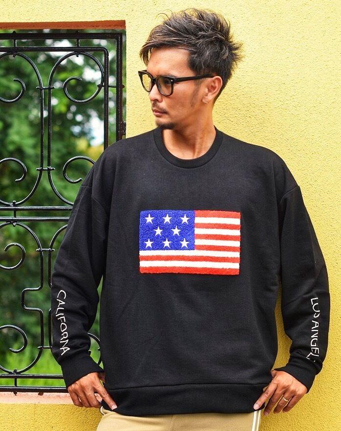 人気 別注 ☆ 星条旗 サガラ 刺繍 ビッグシルエット トレーナー メンズ レディース ペア カップル サーフ アメリカ国旗 トレンド ファッション