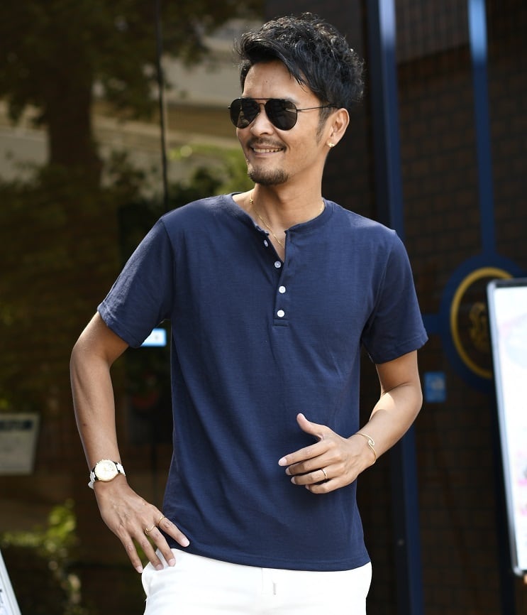 アイポイントが高いヘンリーネックは お洒落上級者的に魅せてくれるスラブヘンリーネックTシャツ。