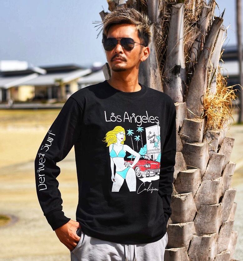 2024 春 新作 ☆ Los Angeles イラスト ビッグ 長袖 Tシャツ ロンT メンズ レディース ペア カップル サーフ カリフォルニア ロサンゼルス アメコミ ビーチ 海 西海岸 トレンド ファッション