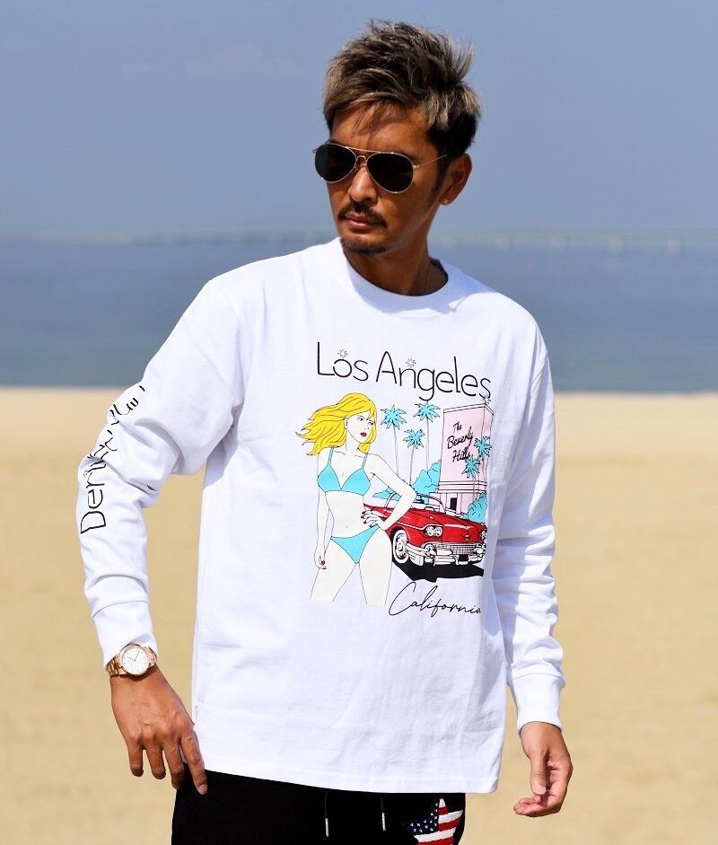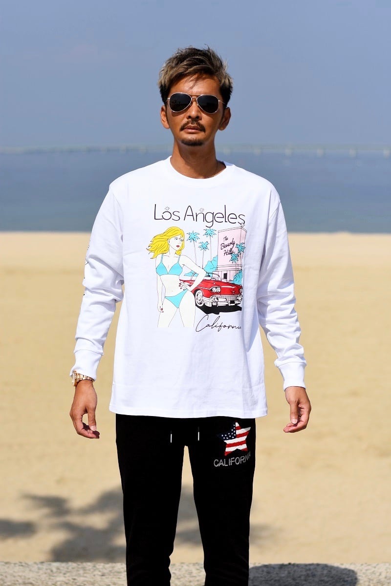 2024 春 新作 ☆ Los Angeles イラスト ビッグ 長袖 Tシャツ ロンT メンズ レディース ペア カップル サーフ カリフォルニア ロサンゼルス アメコミ ビーチ 海 西海岸 トレンド ファッション
