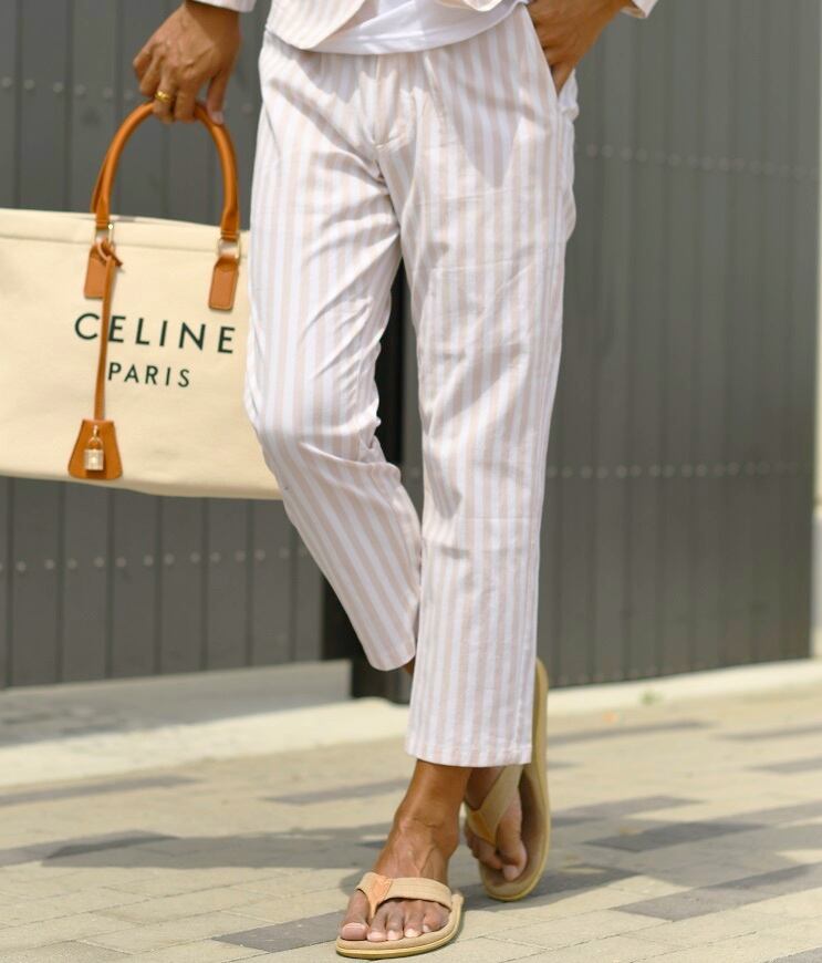 ストライプ柄によるスタイルアップ効果と、アンクル丈に仕上げることで無駄のないスタイリッシュな印象に。
