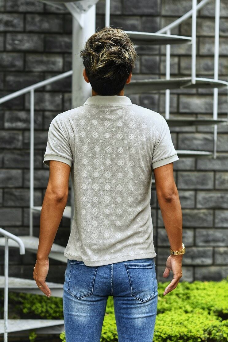 全面に型押しでモノグラムデザインを施したポロシャツ。