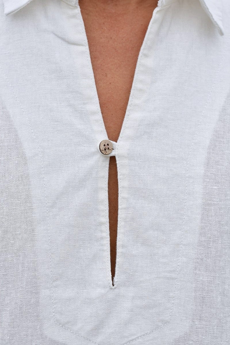 襟元はリゾート感を演出してくれるプルオーバータイプのカプリシャツ。