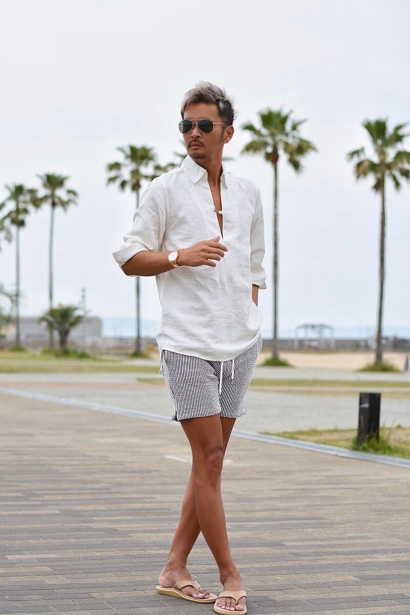 2025 夏 新作 ☆ フレンチ リネン カプリ シャツ 7分袖 メンズ 麻 清涼感 無地 リゾート サーフ SURF 海 ビーチ コーデ 海外 ファッション
