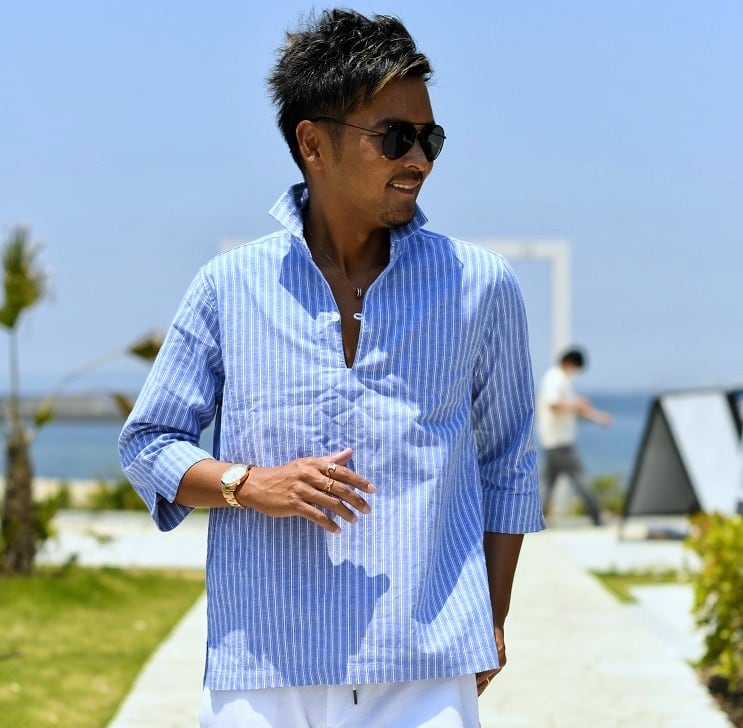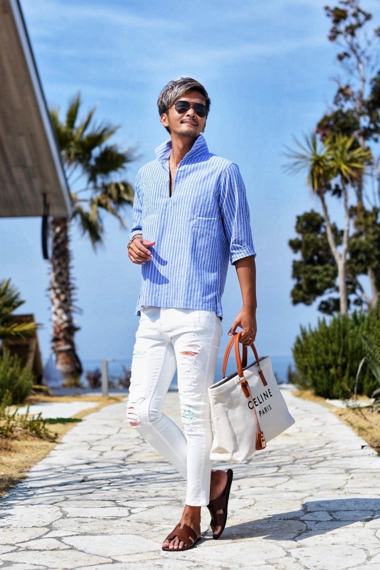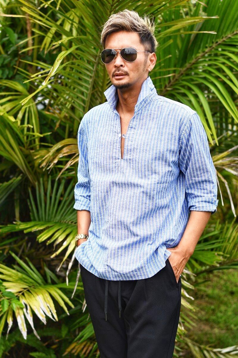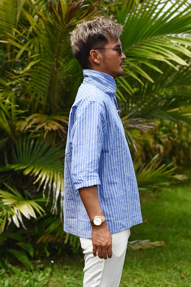 夏 ☆ 綿 麻 ストライプ カプリ シャツ 7分袖 メンズ リネン 清涼感 リゾート サーフ SURF 海 ビーチ コーデ 海外 ファッション