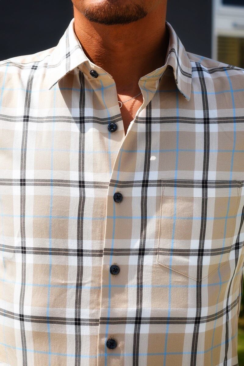 カジュアルになりがちなチェックシャツですが、落ち着いたベージュカラーをベースに