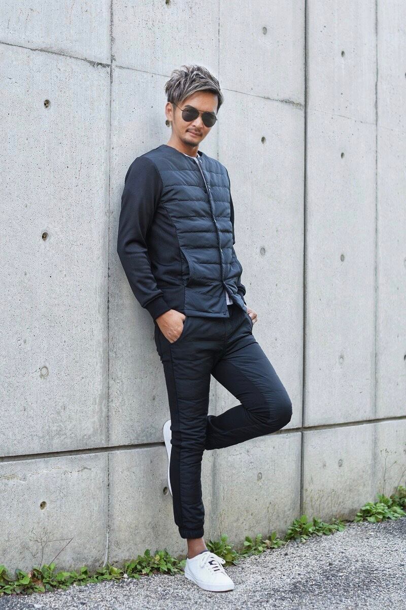 セットアップでの着用は統一感が出てグッとスタイルが引き締まります。