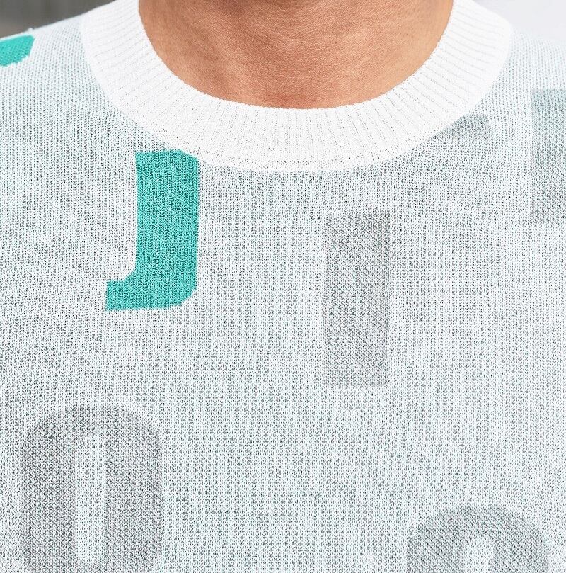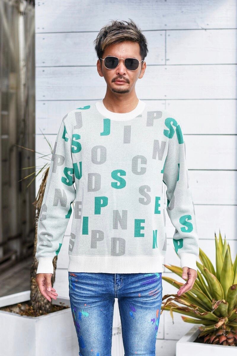 全面にランダムロゴを施したインパクト抜群のニットウェア。