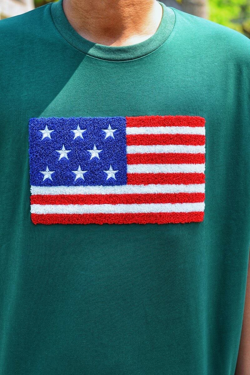 フロントには大きな星条旗柄を立体的な凹凸で仕上げるサガラ刺繍でデザインし、プリントでは出せない奥行きのある柄に仕上げています。
