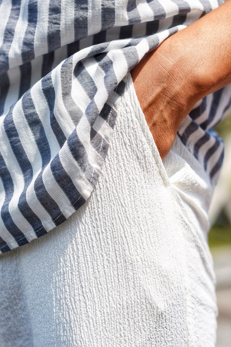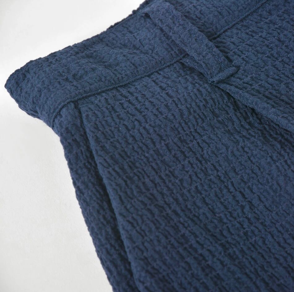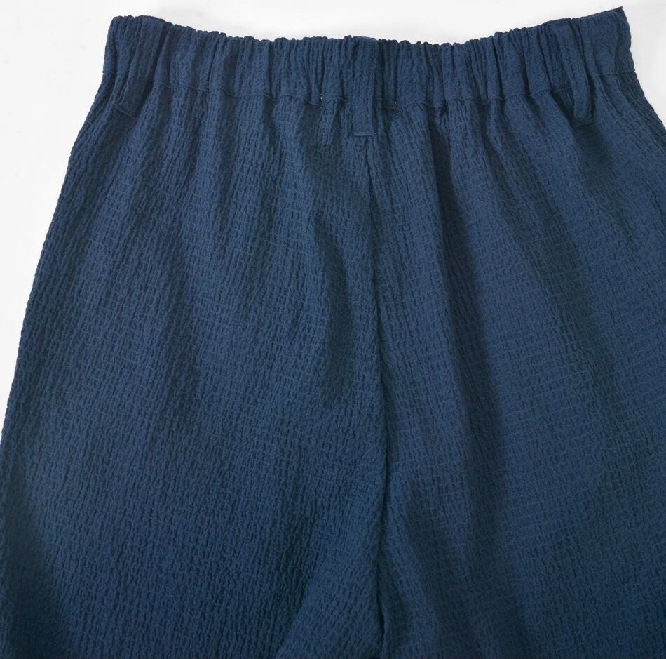 暑い夏にピッタリな素材に、ウエストはコードとゴムでラフに着られるイージー仕様にしています。