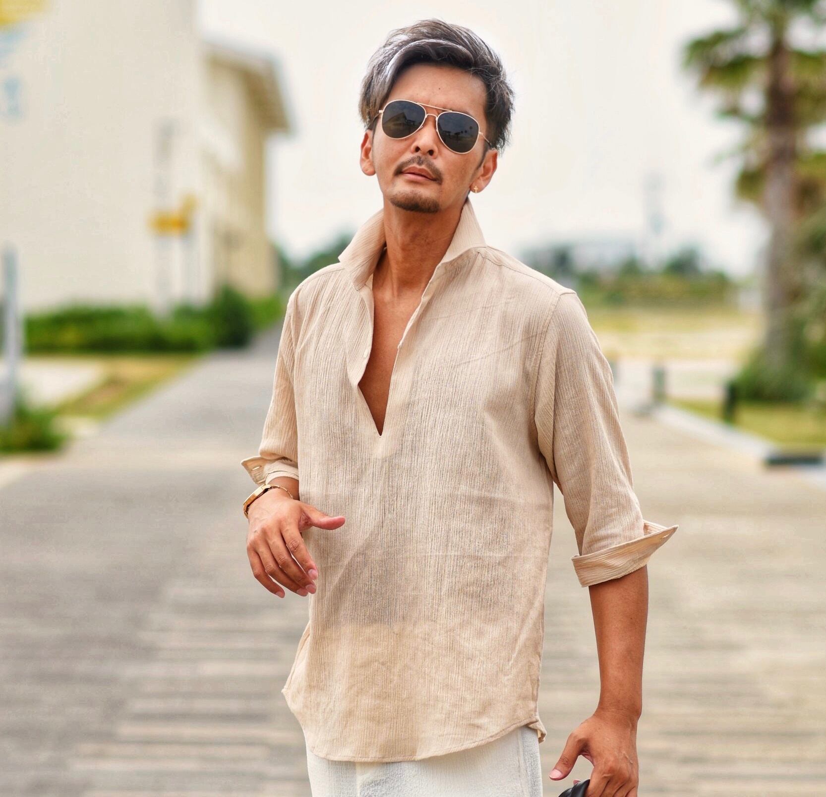 夏 高品質 ☆ リゾート ナーリー カプリ シャツ 7分袖 メンズ 通気性 薄手 涼しい サマー 海 大人 シンプル カジュアル キレイめ 清涼感 上品 海外 ファッション