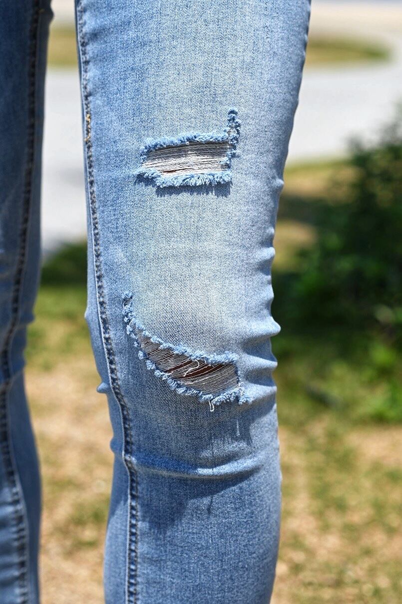 シンプルなダメージ加工と自然な色落ちがこなれ感のある仕上がりに。