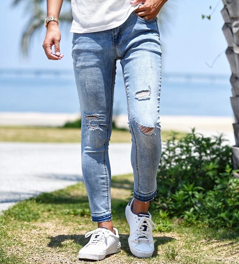 定番 人気 ☆ ダメージ スキニー デニム カットオフ アンクル パンツ メンズ ストレッチ サーフ SURF 海 ビーチ 海外 ファッション