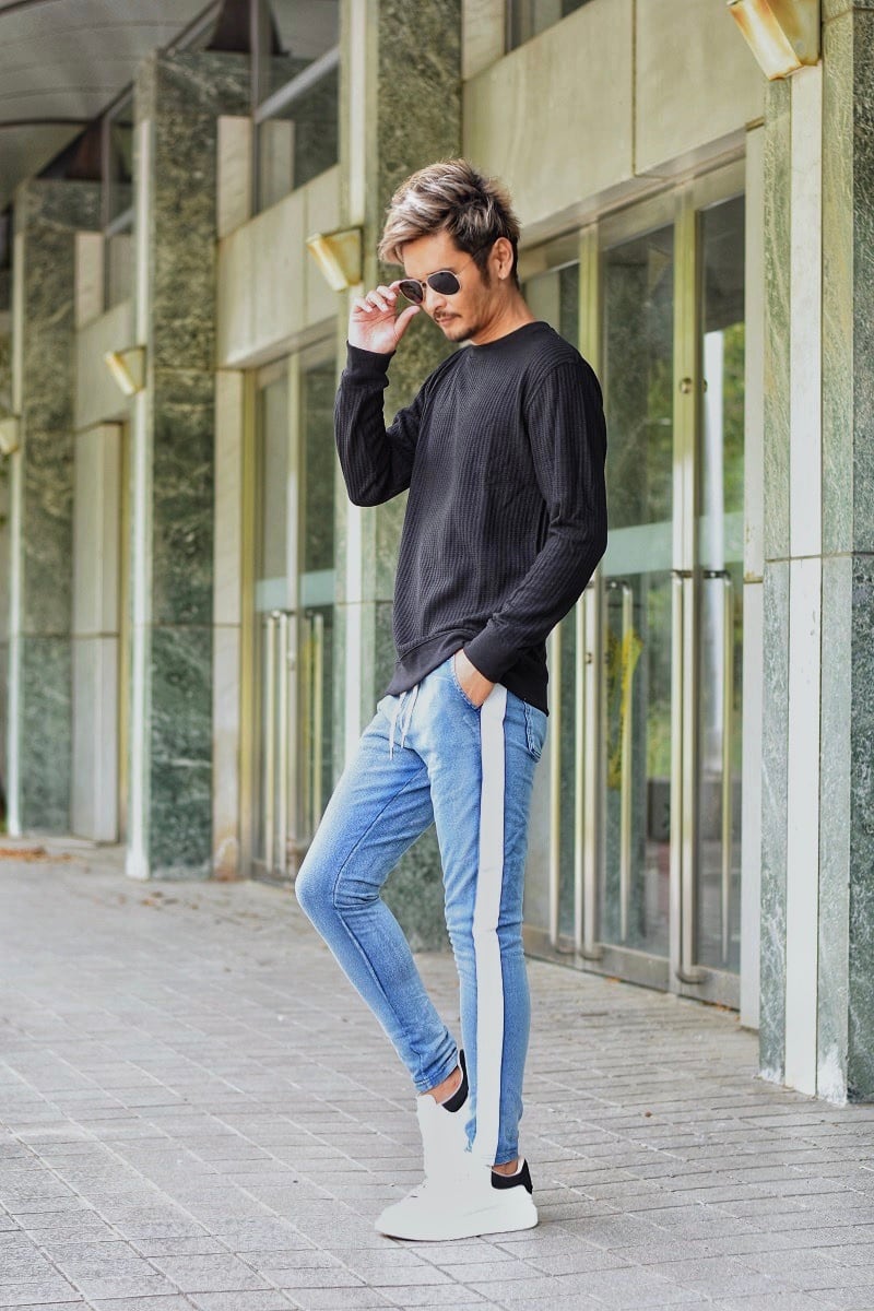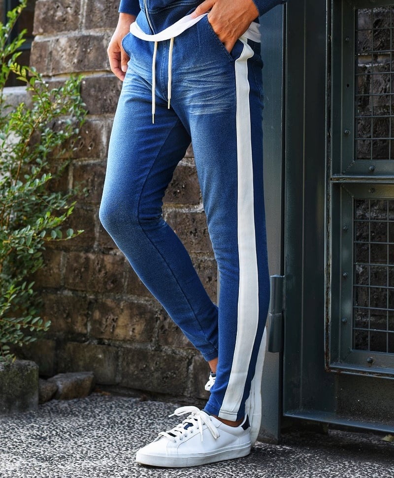 大人な雰囲気を演出するデニムのヴィンテージ感が新しい、デニム風ライントラックパンツ。