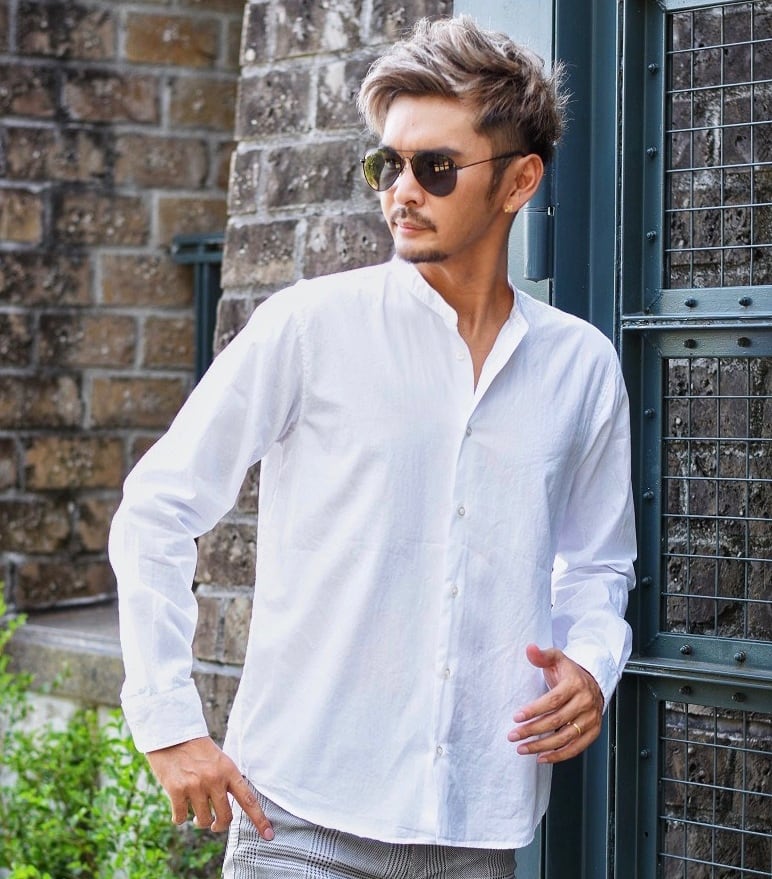日本製、高品質の無地柄ロングスリーブシャツが衿を無くしたノーカラー(バンドカラー)で登場!