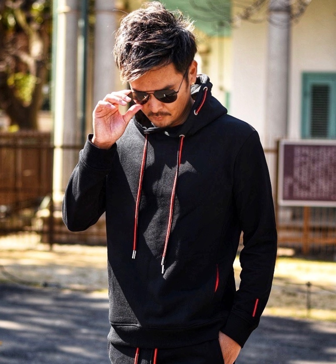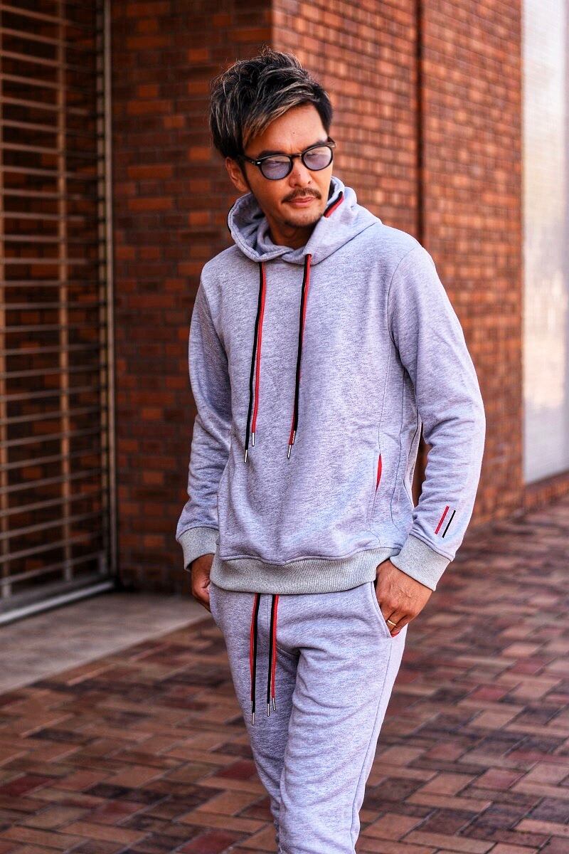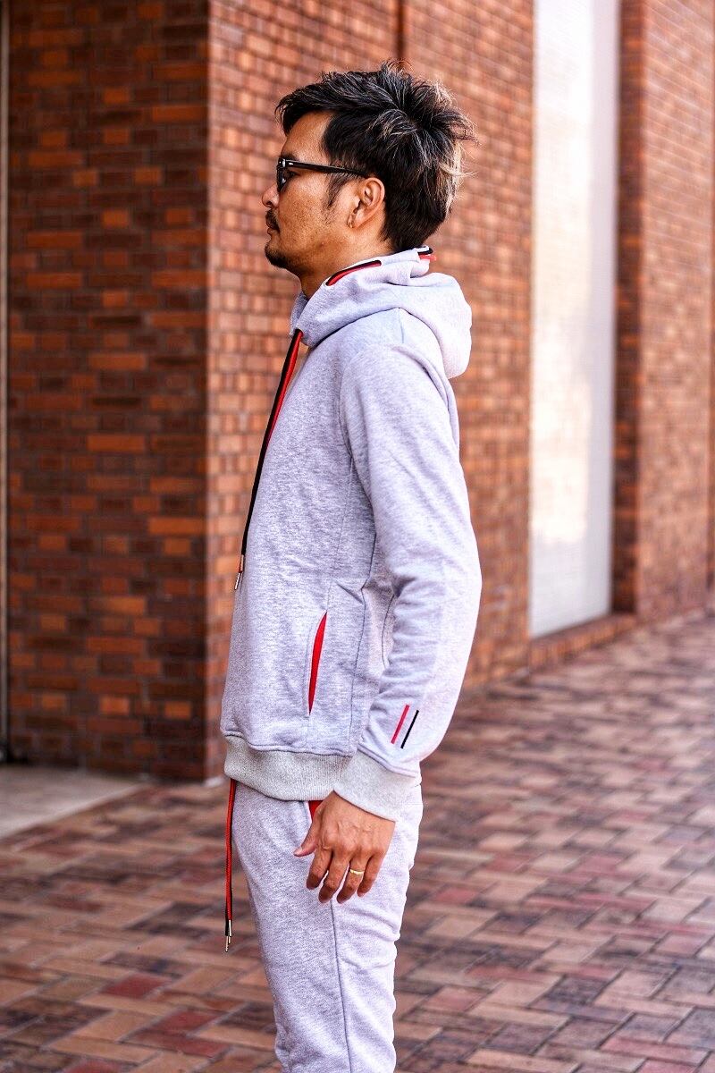 カンガルーポケットを完備し袖口と裾はリブ仕様、さらにフードのアグレットにまでレッドカラーを採用し細部にまで拘りました。