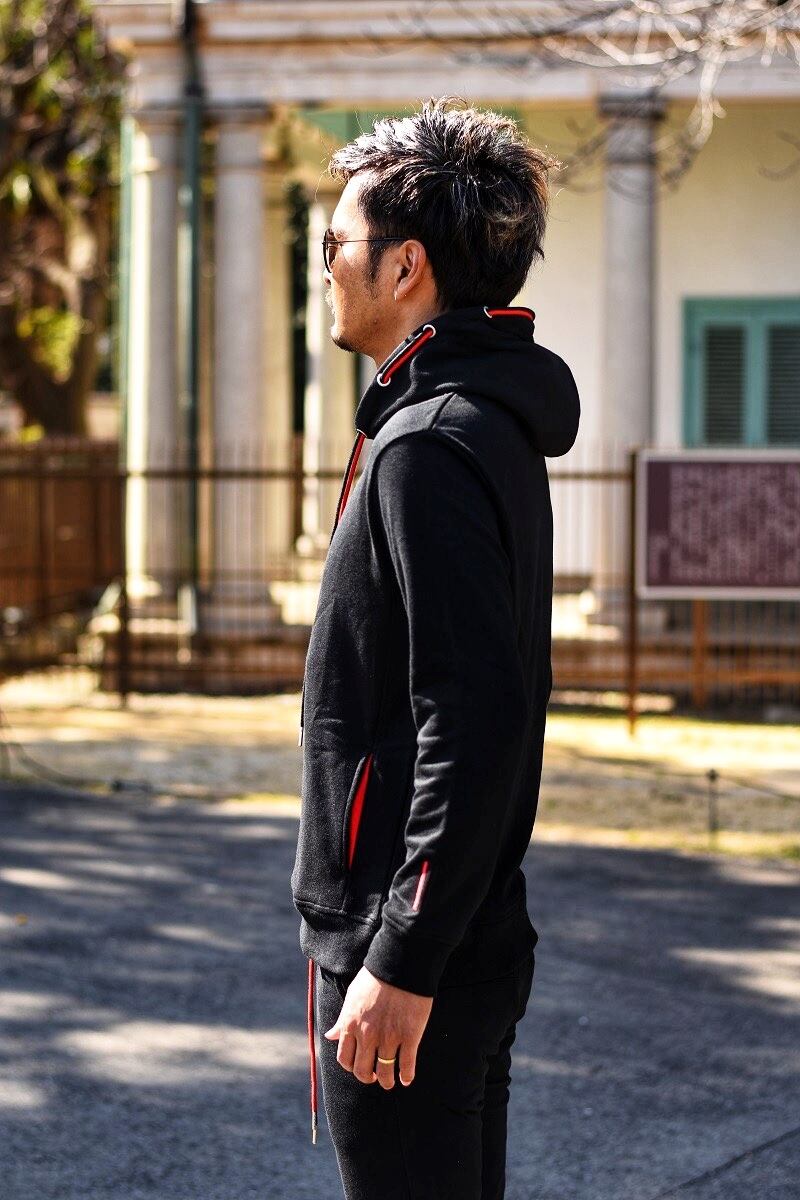 カンガルーポケットを完備し袖口と裾はリブ仕様、さらにフードのアグレットにまでレッドカラーを採用し細部にまで拘りました。