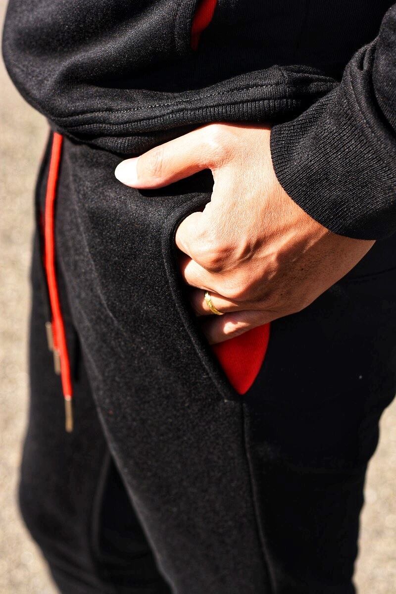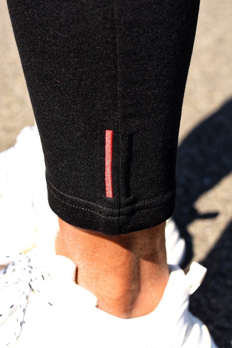 ダブルコードと裾ラインのカラーに映えるレッドカラーがポイントのスウェットパンツ。