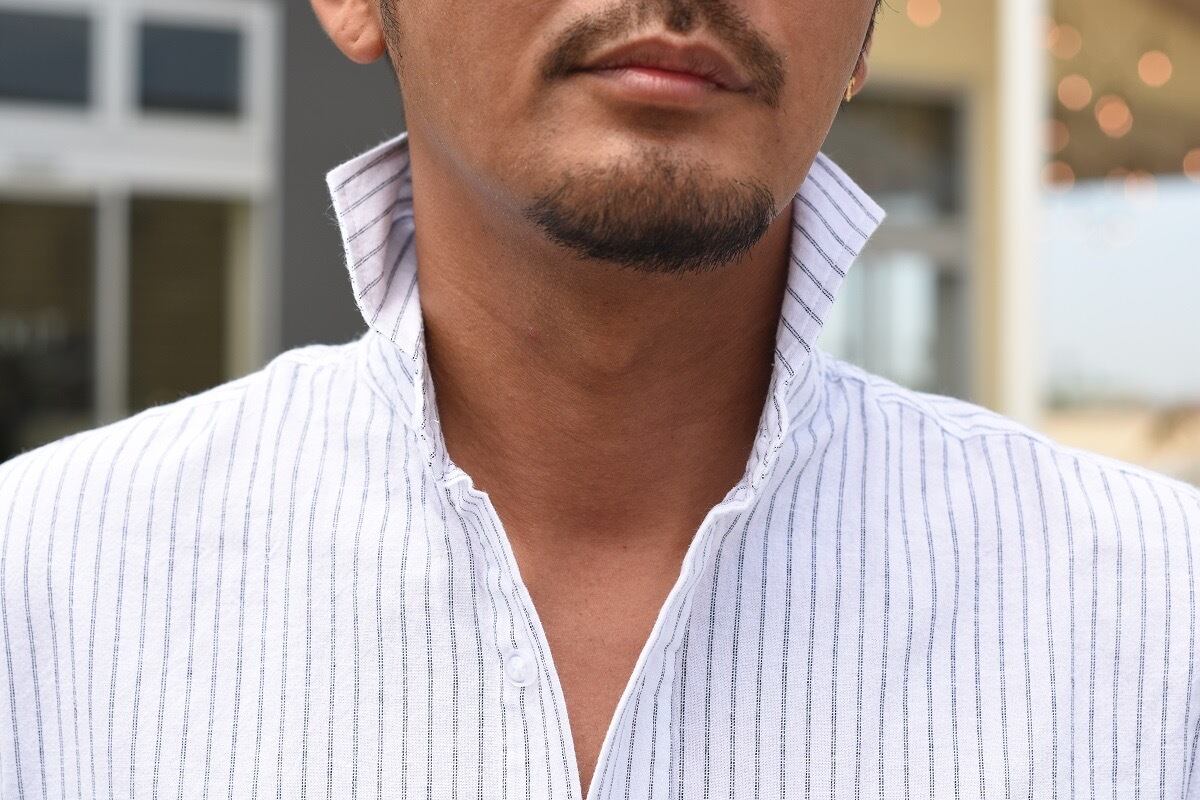 ホリゾンタルカラー(非常に開きが広い襟(衿)の形の事で、ワイドスプレッド・カラーと呼ばれる広めの襟よりもさらに開きが大きい)が特徴的です。
