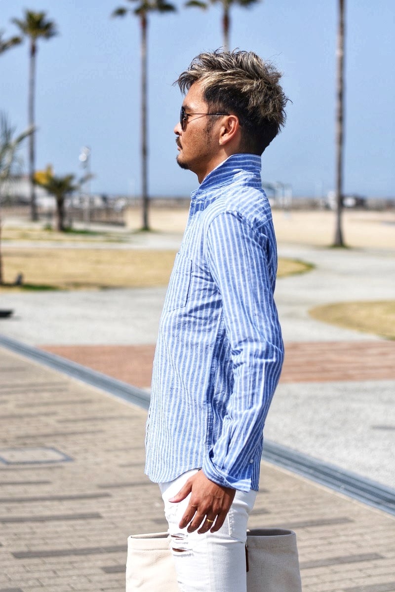 2025 秋 ☆ リネン リゾート ホリゾンタル カラー シャツ メンズ ストライプ 長袖 麻 清涼感 サーフ SURF 海 ビーチ コーデ 海外 ファッション