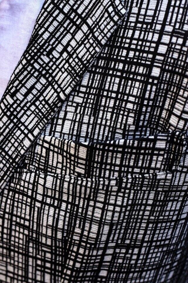シンプルな見た目が多いテーラードジャケットに遊び心のある柄をデザイン。