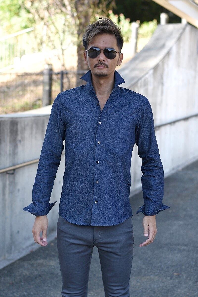 高品質 ☆ デニム ハイクオリティ ホリゾンタル カラー シャツ メンズ 日本製 長袖 スリム タイト 無地 大人 上品 ドレスコード きれいめ コーデ 海外 ファッション