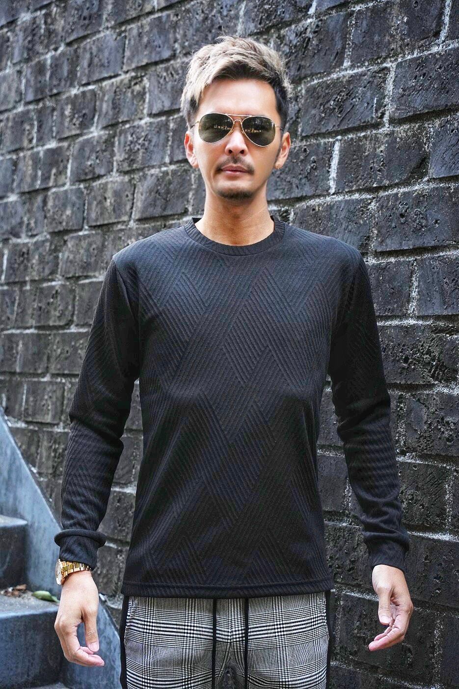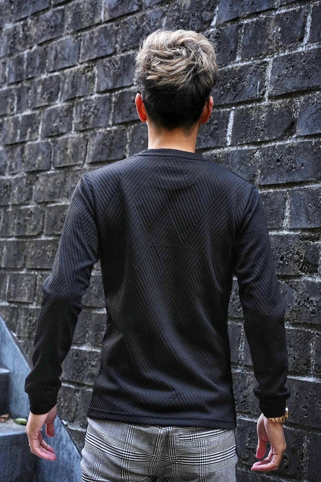 ジャガード加工ならではの高級感艶感が増しワンランクアップする長袖Tシャツ。