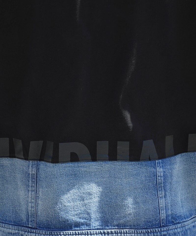 個性的なデザインのデニム切り替えTシャツ。