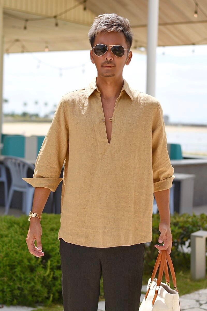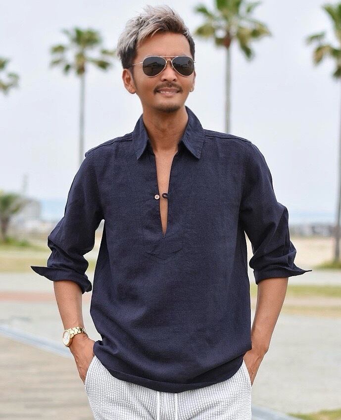 2025 夏 新作 ☆ フレンチ リネン カプリ シャツ 7分袖 メンズ 麻 清涼感 無地 リゾート サーフ SURF 海 ビーチ コーデ 海外 ファッション
