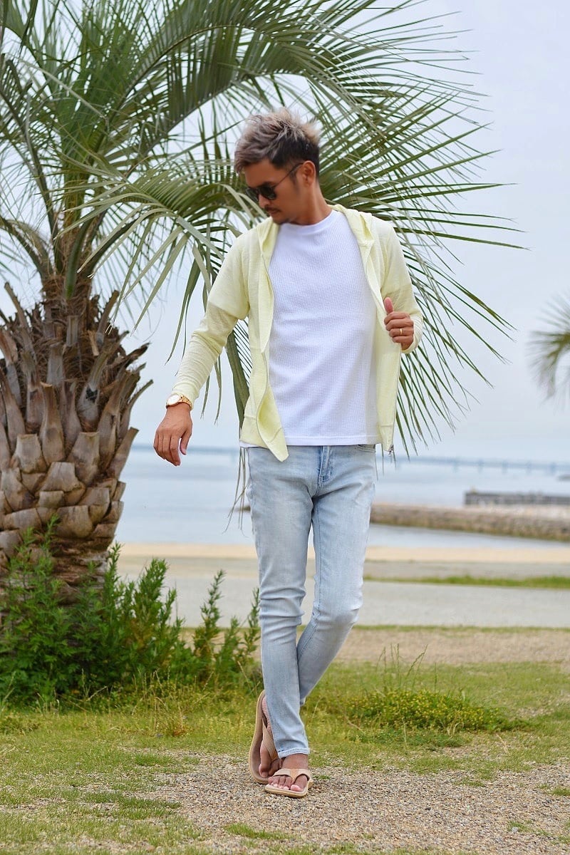 柄物を合わせてさり気なく柄の主張をしてみたり、無地物を合わせる時も透け感の無いものよりレイヤード感が出るので、今最も注目されているパーカーです。