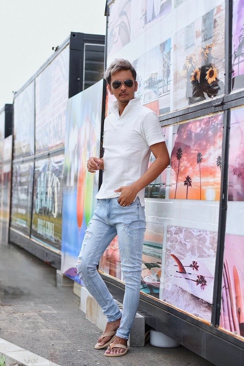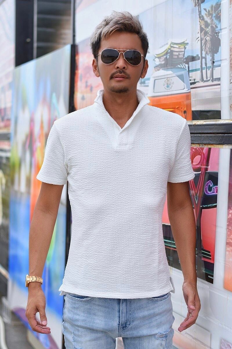 襟元が開いたスキッパータイプのポロシャツなので首元をスッキリと綺麗に見せてくれます。