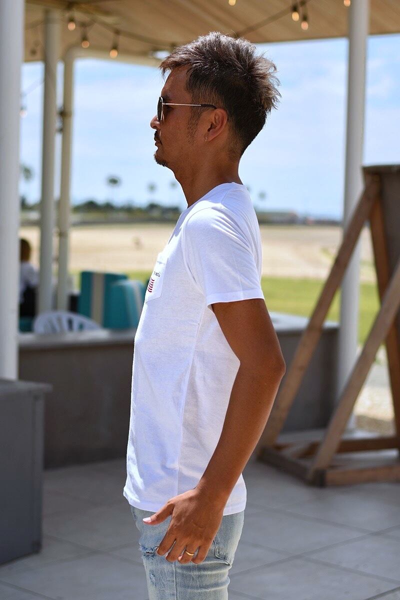 海の似合うヴィンテージ系サーフデザイン胸ポケットがアクセントでお洒落なTシャツ。