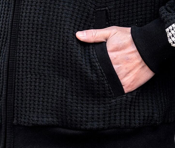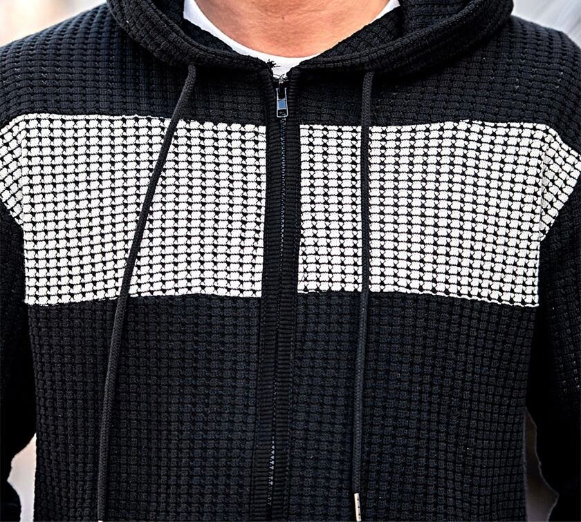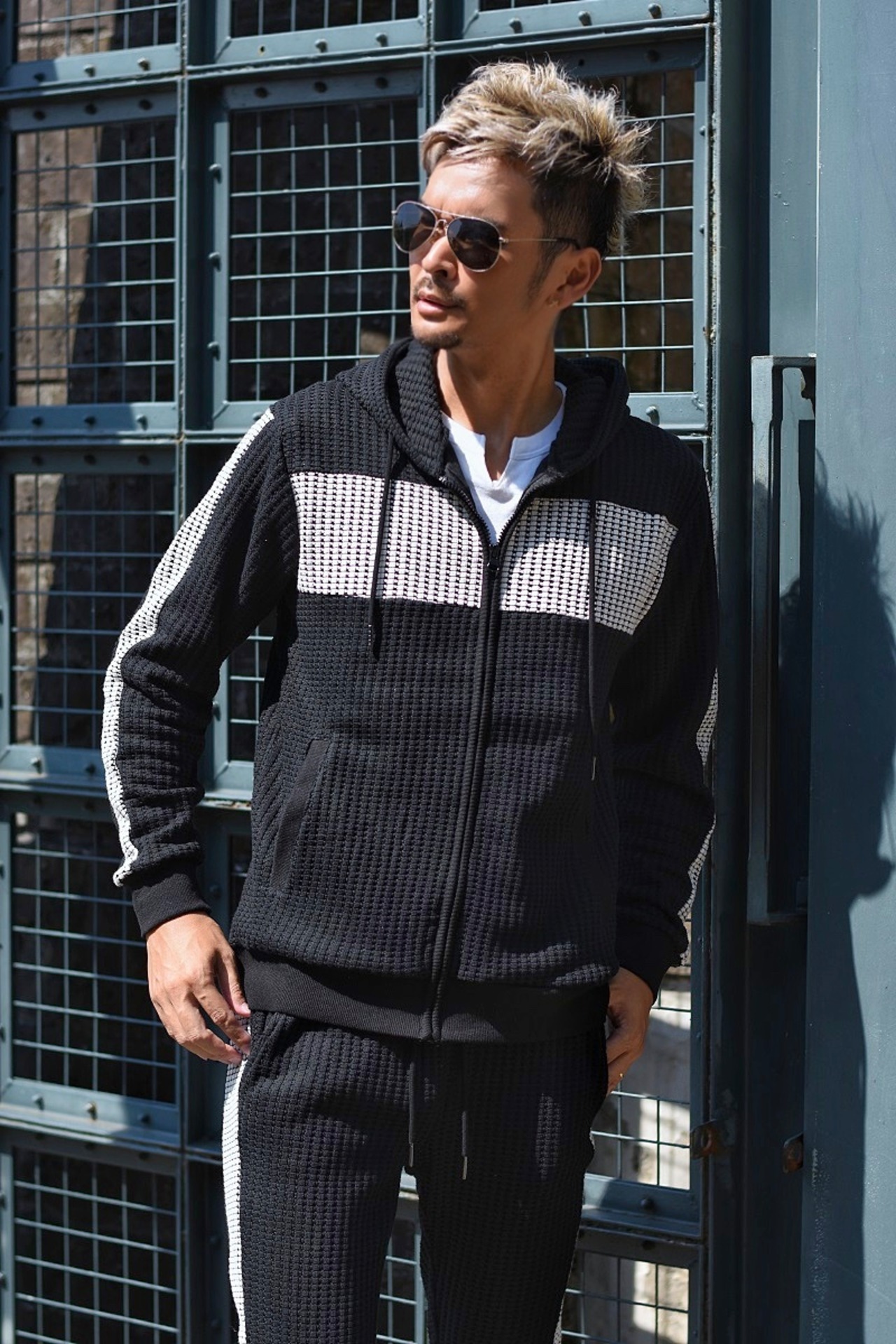 しっかりとした厚みと凹凸のある表面が特徴のワッフル生地を採用したジップアップパーカーとジョガーパンツ。