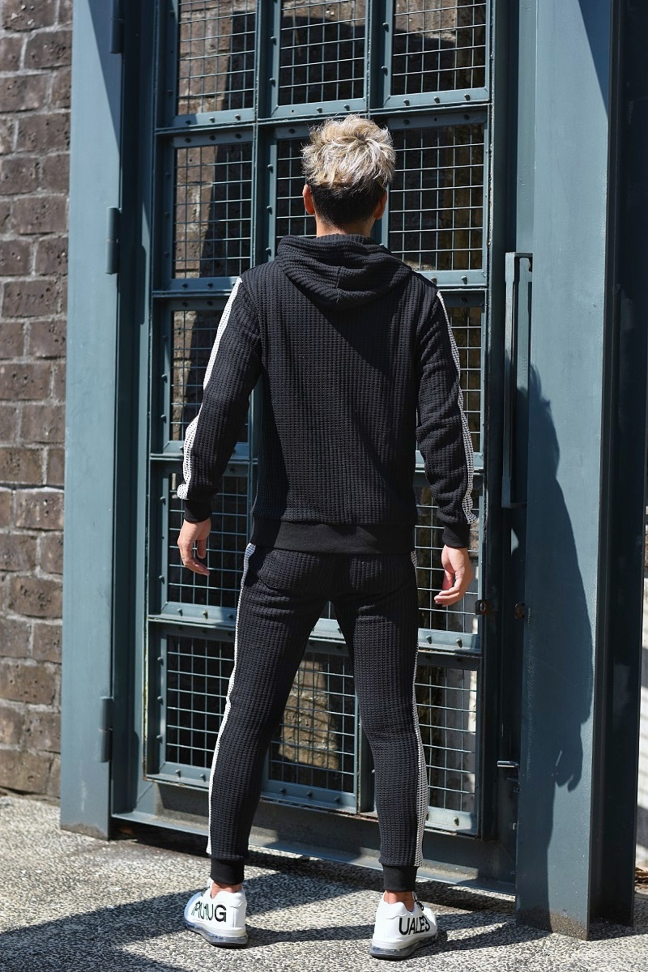 2025 新作 ☆ ビッグ ワッフル サイドライン セットアップ パーカー パンツ メンズ 上 下 スエット ルームウェア ジム スリム 大人 海外 ファッション