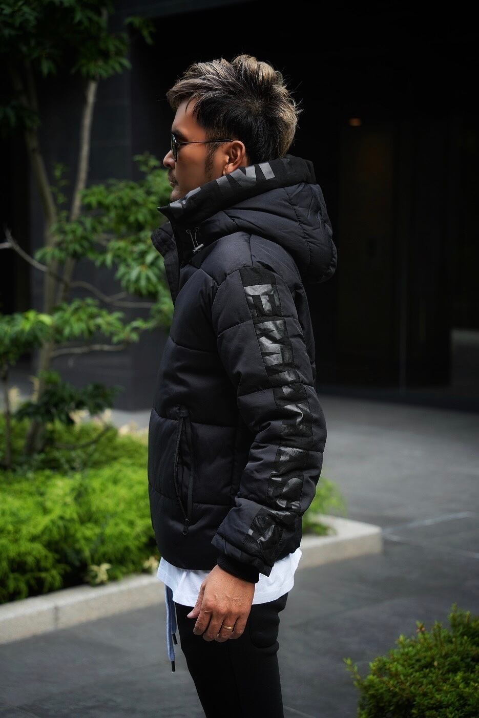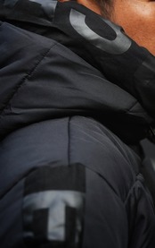 フードと袖のロゴ部分はポリスエード使いで本体と同色の光沢ラバープリントがかっこいい。