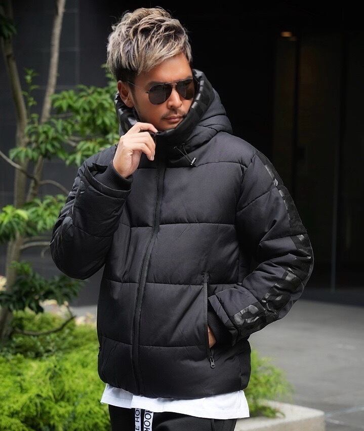 [ フーデット スウェード ロゴ ライン 切替 ファイバー ダウン ジャケット ]