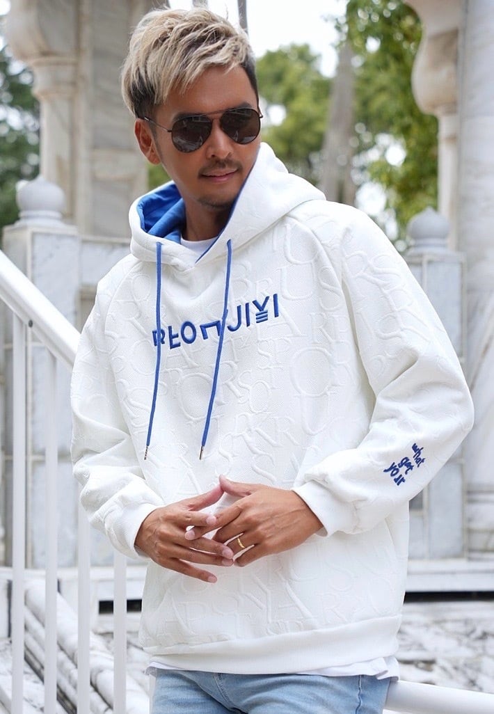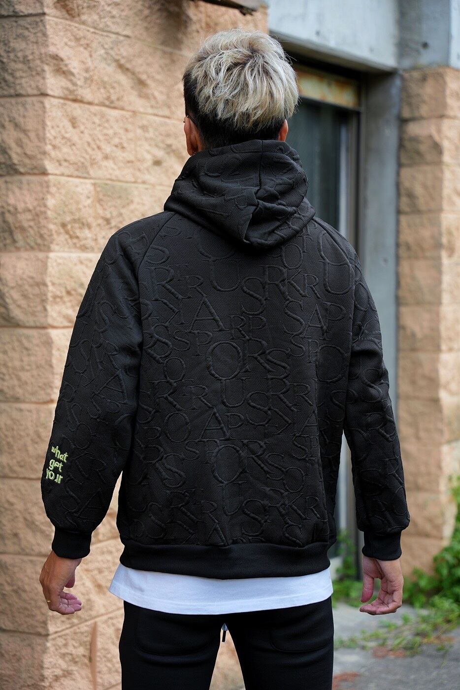 裏起毛が暖かいエンボス ジャガード ロゴ 刺繍 パーカー。