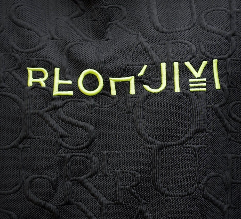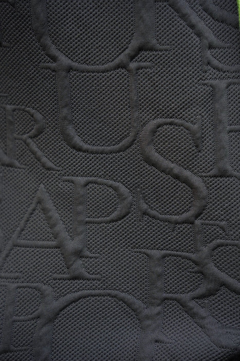 英字が膨れジャガード加工で浮き出た生地がお洒落。