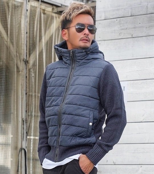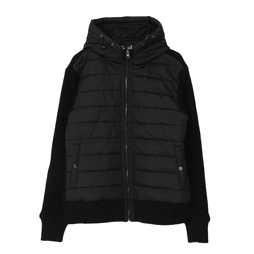 ナイロンとニットを組み合わせた異素材ミックスの切り替え中綿ブルゾン。